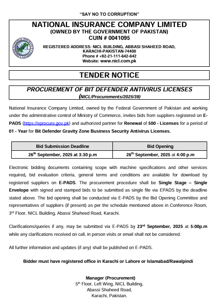 Bid Defender Antivirus Licenses Renewal" (NICL/Procurement/2025/39)